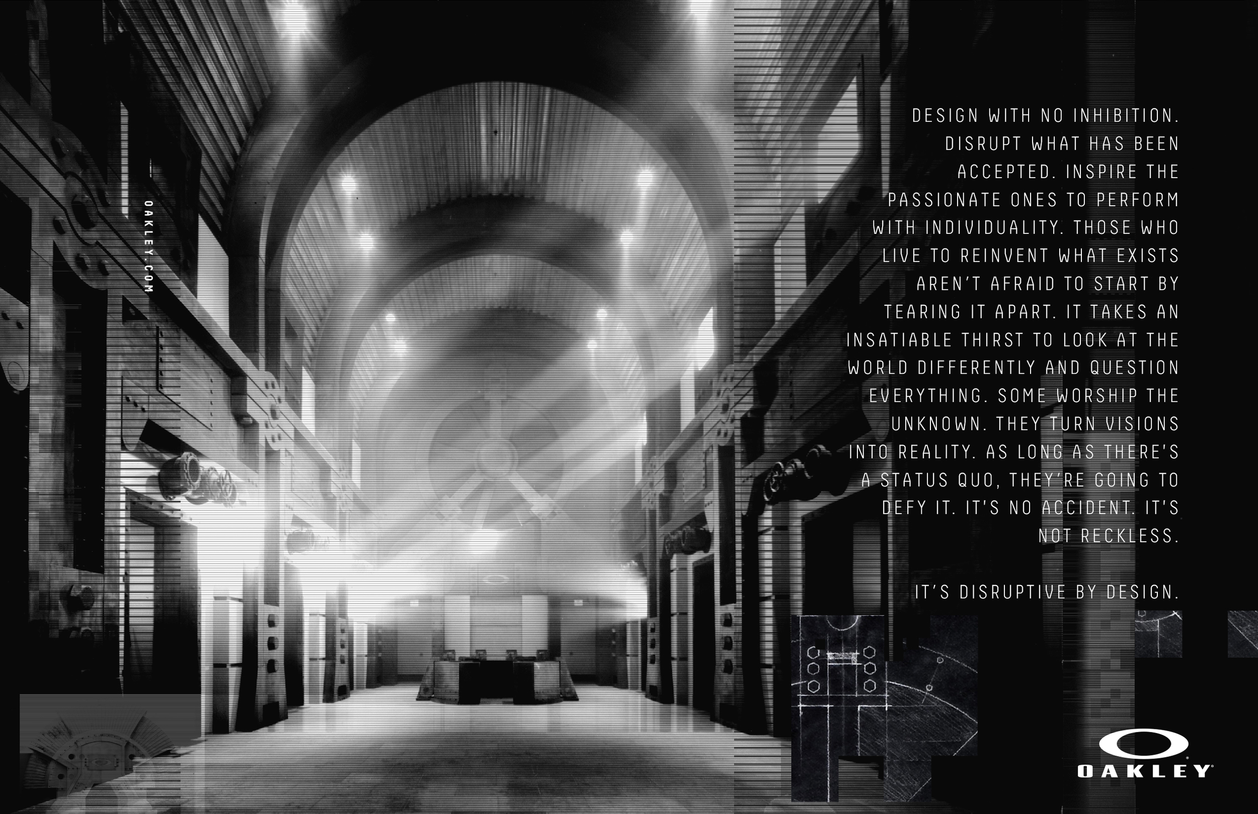 Oakley's expansion into varied product categories meant their audience was becoming broader and the messages more disparate. It was leading them down a path that felt softer than the true ethos of the brand. We set out to recapture the connection between Oakley's anti-establishment attitude and its passionate approach to product design. The best place to start was with the ideals of Oakley's founder Jim Jannard when he started the company in his garage in the 1970s. We expressed that there is still a beautifully chaotic purpose to everything Oakley does. They are inherently disruptive by design.
